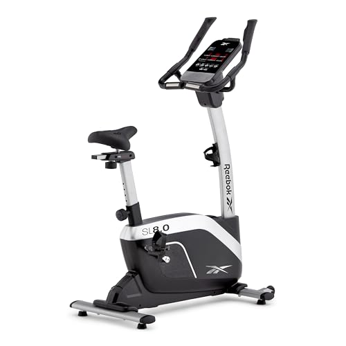 Reebok Fitness Stationary Bike: Bluetooth Compatible Indoor Cycling Bike, 24 Resistance Levels, 12 Workouts, Upright Exercise Bike with Gel Pad Saddle