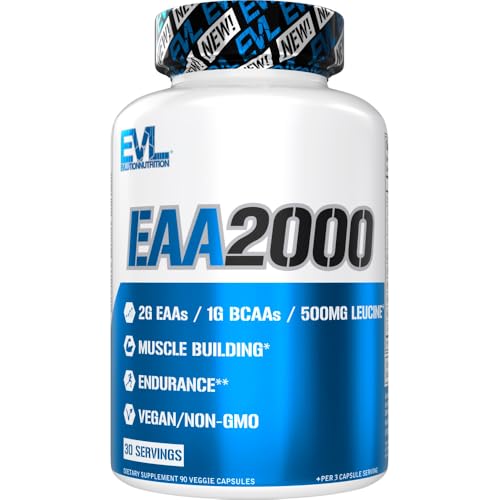 Evlution Nutrition EAA2000 – Pre & Post Workout Capsules – Muscle Building + Recovery Supplement – 2g Essential Amino Acids + 1g BCAAs – Endurance + Energy Support – 30 Servings