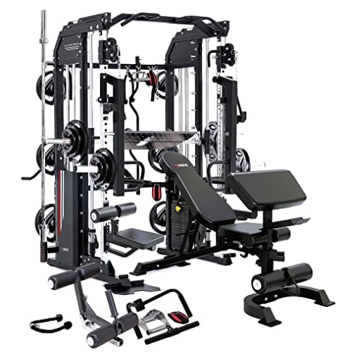 Smith Machine, Power Rack with LAT Pulldown System, Power Cage with Cable System, Squat Rack for Home Gym with Chest Press Machine, Spotter Arms, Leg Curl Attachment and More