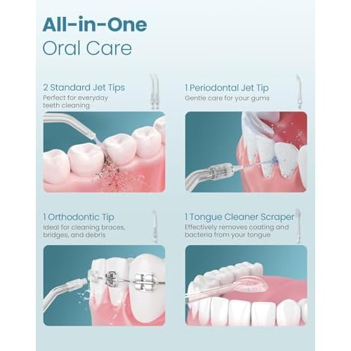 Personalized Deep Cleaning: Onlyone water dental flosser has 4 pressure settings and 5 tips for tailored care from gentle to intense. It features a memory function to save your settings and operates quietly under 55dB for effective, personalized oral care