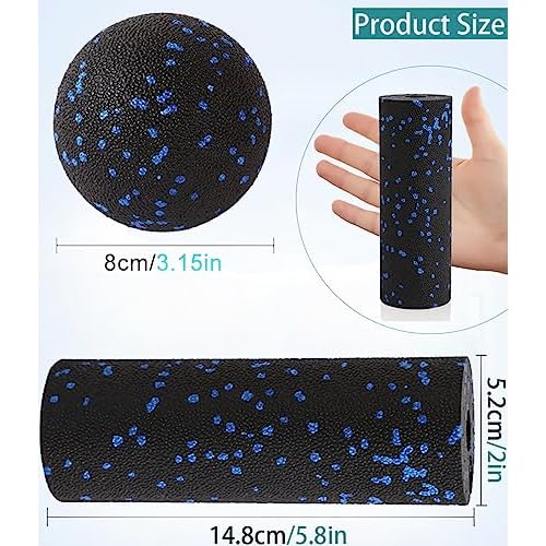 The fascia set: Mini Roller: 14.8cm x 5.2cm(5.8″ x 2″), the length is similar to that of a mobile phone. Massage balls: 8cm(3,5″) 8cm, Ergonomic – Duo-ball can be used universally. The Duoball is particularly suitable for neck and back exercises along the spine, in which the muscle tissue can be optimally massaged