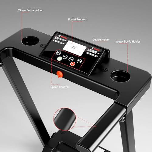 Preset Program & LED Display – This small treadmills for home has 12 preset program modes, 3 control modes with 3.6-inch multifunction LED display that makes it easy to track time, speed, distance. In addition, it is also equipped with 2 cup holder, tablet/mobile phone holder, safety key. Always ensure the safety key is properly secured before starting your workout.