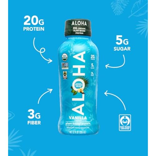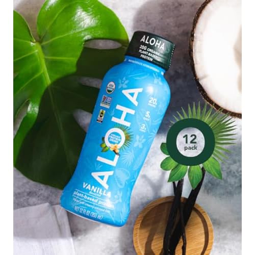 ALOHA Organic Plant Based Vanilla Ready to Drink Protein Shake w/MCT Oil (12 ct, 12oz Bottle) 20g Protein, Meal Replacement, Low Sugar & Carb, Gluten-Free, Paleo, Non-GMO, No Soy, Stevia or Sugar Alcohol…