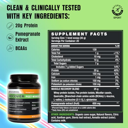 Discover the power of swift recovery with BODi’s Beachbody Performance Recover Orange Whey. Designed to help combat exercise-induced muscle soreness and support muscle growth, this high-quality protein supplement is a game-changer for your post-workout regime. Featuring 20 grams of premium protein, it aids in muscle repair and growth,helping you bounce back strong after every session. Enhanced with pomegranate extract, it effectively helps reduce post-workout muscle soreness and speeds up your recovery process, making it one of the best supplements for muscle recovery available.* Unlock the full potential of your workouts with the inclusion of Branched-Chain Amino Acids (BCAAs) in a 2:1:1 ratio. BCAAs help to promote muscle protein synthesis and rebuilding. Whether you’re looking for reduced muscle soreness, faster recovery, or robust muscle growth support after a workout, this recovery supplement delivers exceptional results. Available in vegan and whey options, our formula has no synthetic colors, and no artificial flavors, sweeteners, or preservatives. Clinically tested and certified by Informed Sport, it stands out as an ideal choice for recovery supplements post-workout, ensuring your path to peak fitness is both effective and health-conscious.* *These statements have not been evaluated by the Food and Drug Administration. This product is not intended to diagnose, treat, cure, or prevent any disease.