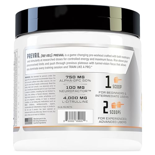 Prevail Pre Workout Powder with Nootropics: Pre Workout for Men and Women, Cutting Edge Energy and Focus Supplement with L Citrulline, Alpha GPC, L Tyrosine, Neurofactor | Peach Mango, 40 Servings