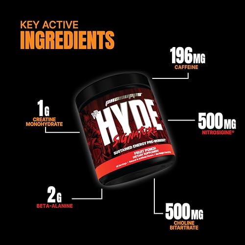Crush Every Workout with HYDE: ProSupps Mr. HYDE Signature is a pre-workout powder designed to enhance energy, focus and promote increased blood circulation for peak muscle performance. Developed with trusted ingredients to help anyone from all fitness levels. Fruit Punch Flavor. 30 servings. 196 mg caffeine/serving.