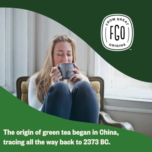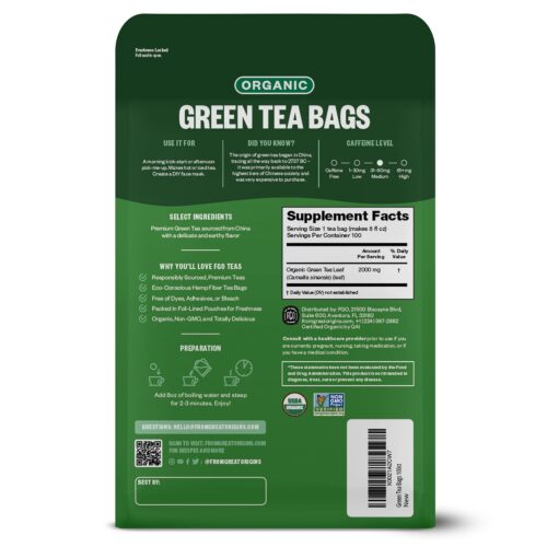 FGO Organic Green Tea, 100 Count Eco-Conscious Tea Bags, Caffeinated, Resealable Pouch, Packaging May Vary (Pack of 1)