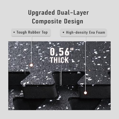 [Upgraded Dual-Layer Design]: Concerned about your equipment scratching the floor during workouts? Our 2in1 Rubber Top EVA Foam Exercise Gym Mats are crafted to solve this issue. The textured rubber top layer, combined with a high-density EVA foam bottom layer, seamlessly creates a non-slip tough surface with excellent shock absorption.