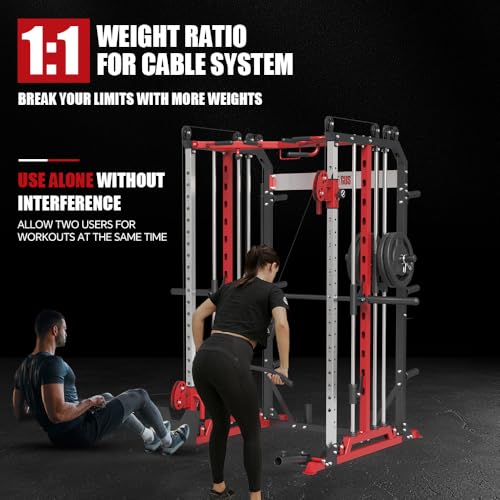 INTEGRATED FUNCTIONAL TRAINER: Seamlessly combines simthe machine with versatile pulley system, featuring 20 height adjustments for comprehensive strength training. Featuring dual pulley systems, home gym station facilitates simultaneous training sessions, making it the ultimate choice for family and friends to work together in your home gym, ensuring unparalleled comfort and stability throughout your workout sessions.