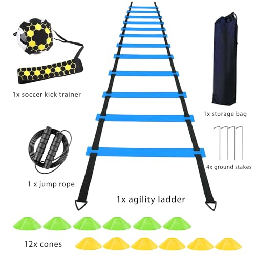 20FT Agility Speed Ladder Training Equipment Set Soccer Gifts for Boys 8-14 with 12 Cones, Solo Trainer & Jump Rope, Suitable for Home Gym and Playground