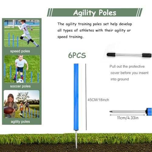 【6 Pcs Soccer Agility Poles】Each of Agility Pole length of 18 inches, a length of 5 inches for ground nails,total of 6 pcs agility poles. The pointed design of the stainless steel agile rod makes it easy to insert and ensures stability. Single agility poles easy setup and storage, setting up an obstacle course training is quick and easy for youth or kids.Suitable for outdoor, garden, lawn, land, sand. It comes with a carrying bag for easy portability and storage.