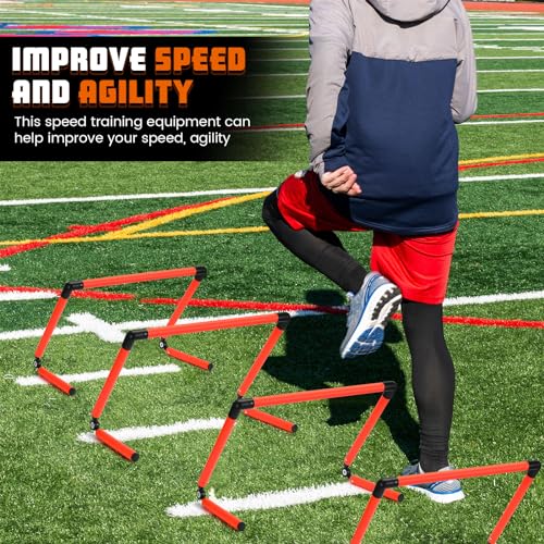 Adjustable, Portable, and Lightweight Speed Training Hurdles: push your athletic boundaries with adjustable hurdles for agility training that can be tailored to 6, 9, or 12 inches; Assemble these lightweight and portable workout hurdles within minutes; Disassemble and store or transport the hurdles without any hassle; Nurturing flexibility and space efficiency, the real time adjustability feature makes these hurdles a preferred choice for athletes