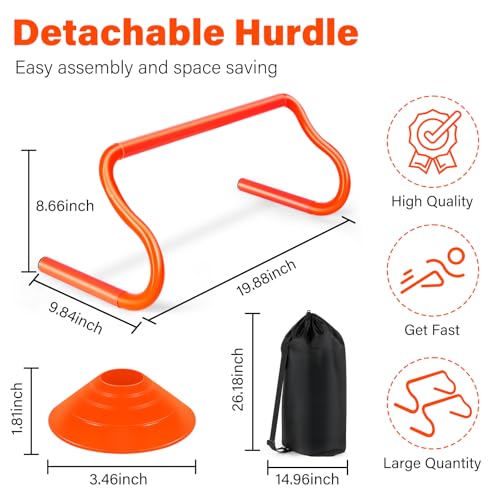 Agility Training Equipment Set: Package Contents: 5 Agility Hurdles + 10 Football Cones + 1 Carrying Bag. Made of lightweight, durable, weatherproof PP, shatterproof and sturdy. Bright colors ensure high visibility during indoor and outdoor training.