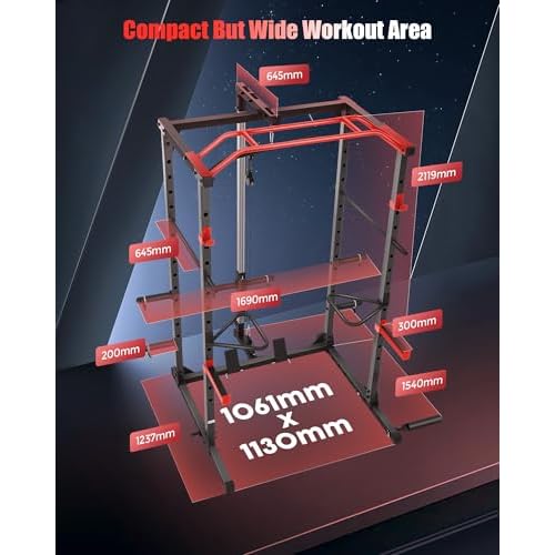 【Versatile Workouts】Our multi-functional power rack is adeptly designed to cater to both novices and athletes. The workout machine incorporates a range of attachments for versatile workouts, such as dip station, pull up, chin up, push up, etc. We are also equipped with upper and lower pulley system for lat pulls down, seated rowing. This power rack cage gives you the flexibility for various strength training workout, within a safe environment and in a compact space.