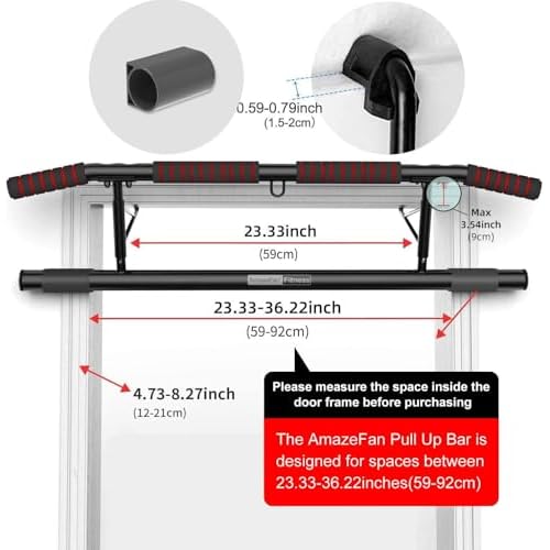 💪【MORE DETAILS】 Our pull up bar for doorway can fit all doors, even doors in the corner and he narrower doors.The distance between the two “hook ” is cut down to 21.65 inch, It can fit a door width of 21.65”- 36.22” (55 – 92 cm) and depth of 8.27” (21 cm), acceptable trim height up to 3.54″(9 cm). Please measure the space inside the door frame before purchasing.