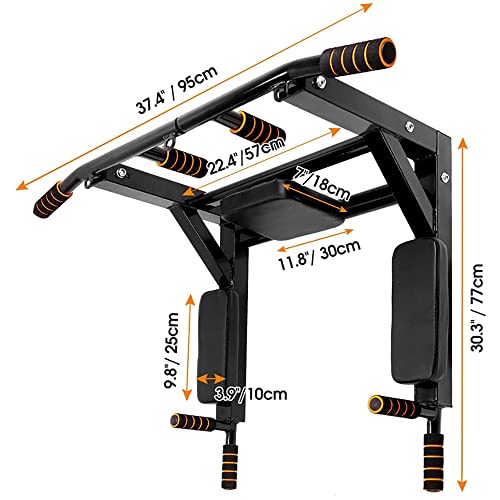 Heavy Duty Steel Construction:This wall mounted multifunctional pull up bar is made of heavy duty steel,(1.5” x 1.5” heavy-gauge steel square pipe), with high density non-slip grips and padded back and armrests from duraleble high quality eco-friendly material, this unit is built to last,which offers great stability and rigidity,supports up to 440 pounds