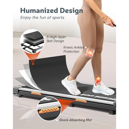 Space Save and Easy to move: This under desk walking pad treadmill has a compact design. The body size is 48*20.5*4.6 inches which can be easily placed under the sofa, bad and desk. With built-in wheel design, it can be easily lift and moved