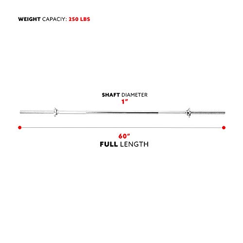 250 LBCAPACTIY: Threaded chromed sleeve bar holds weights up to 250 pounds Accommodates weight plates with 1 inch center hole. Ergonomic design keeps storage easy. Simply clean your weighted bar to wipe away debris and sweat.