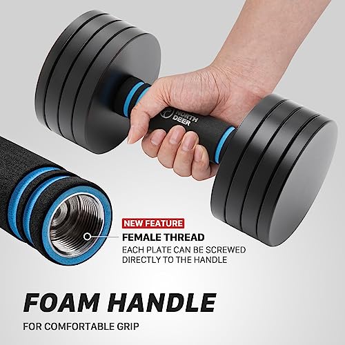 GREAT QUALITY: The frosted surface gives the dumbbells a premium, textured look and better protection against scratches. The elastic, foam-covered handles provide a good grip and protect your hands during workouts. The steel handles can tolerate up to 220lbs, giving the dumbbells enough room to add extra weights.