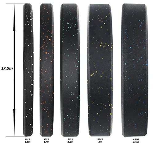 Package Includes: 2 X 10LB, 2X 15LB, 2 X 25LB, 2 X 35LB, 2 X 45LB Olympic Bumper Plate. Low bounce for safety.