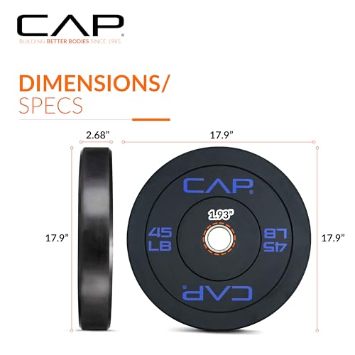 The CAP Barbell Best Bumper Plate Set offers protection for both the barbell and the bumper plates with its sound construction. The steel insert hubs reinforce the holes and protect the bar at the same time. This Olympic weight plate set can only be used with Olympic bars (with a 2-inch sleeve diameter). Each weight is made from solid cast iron and coated in virgin and recycled rubber. Adding weights to any fitness routine helps to increase muscle mass while burning more calories and reducing body fat. Add these Olympic bumper plates to your home gym and start experiencing the benefits they can offer to your fitness routine. 30-day manufacturer .