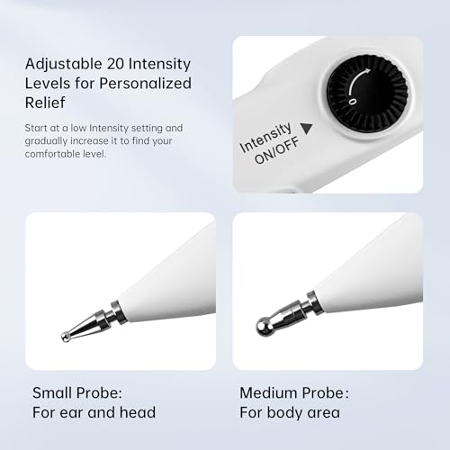 20 INTENSITY & SENSITIVITY: The acupuncture pen features 20 adjustable intensity levels and the customizable sensitivity settings to match individual skin responses. Simply select your desired intensity based on treatment requirements and adjust sensitivity according to personal comfort. For optimal results, we recommend starting at level 1 and gradually increasing intensity as needed.