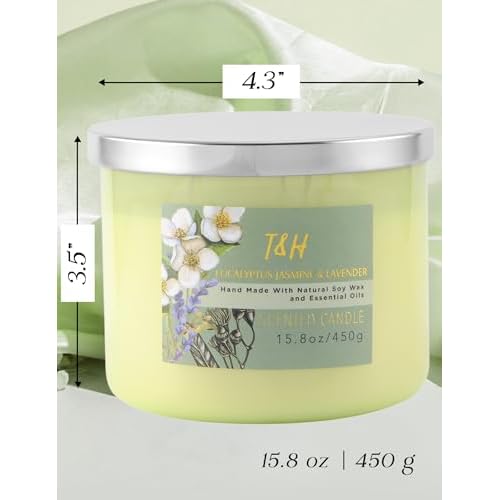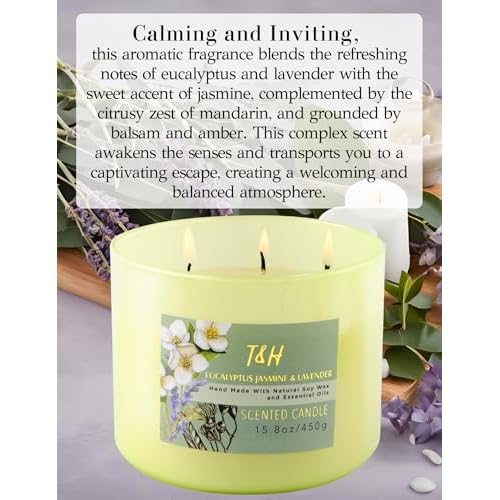 🕯️ Refreshing 3 Wick Scented Candle: Immerse yourself in the uplifting aroma of our Eucalyptus Jasmine and Lavender 3 wick aromatherapy candle, infused with notes of Eucalyptus, Jasmine, Lavender, Mandarin, Balsam, and Amber essential oils. This calming yet energizing blend opens with fresh herbal notes and soft florals, gently balanced by subtle warmth and a serene, woody finish. The result is a clean, tranquil scent that feels both refreshing and comforting. This 15.8 oz 3 wick soy candle is designed to soothe your senses and elevate any space, perfect for your home, kitchen, bathroom, or office.
