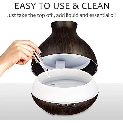 ELEGANT LOOKING & LARGE CAPACITY — The aromatherapy essential oil diffuser is made of plastic with a faux wood look and modern design, it blends naturally with most home decor. The changeable colored lights bring an elegant view, create a relaxing atmosphere to the room, and make your life more colorful. The large 550ml capacity is ideal for large rooms and covers an area of up to 480 ft².