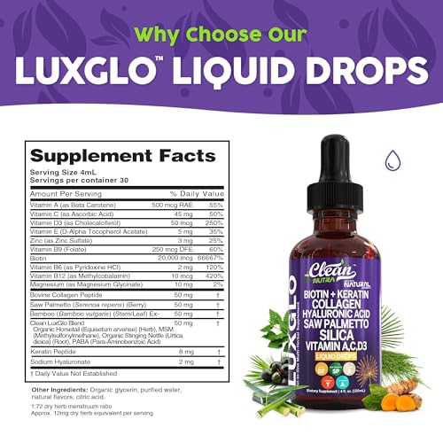 Biotin Liquid Drops Collagen Keratin Hyaluronic Acid Saw Palmetto for Hair Skin and Nails Silica Vitamin A C Vitamin D Bamboo Turmeric Zinc Folate Magnesium Horsetail LuxGlo by Clean Nutra