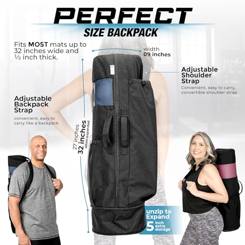 EXPANDABLE FOR EXTRA WIDE YOGA MATS : Our yoga mat bag expands from 27″ to 32″ to create additional storage for long and wide yoga mats. Our gym bag with yoga mat holder will fit most yoga mats up to 32 inches and 6 inches in diameter.