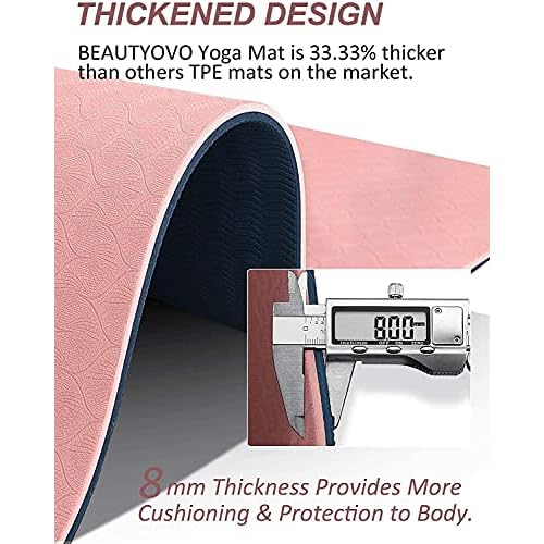 â–¨ PREMIUM ECO FRIENDLY TPE MATERIAL – The material of a mat will determine the texture, stickiness, sponginess, and eco-friendliness. Most yoga mats are made of either plastic or rubber. BEAUTYOVO eco friendly TPE yoga mat moisturizes the advantages of plastic and rubber in one, which features higher elasticity, better abrasion & tear resistance, and more eco-friendly than traditional PVC, NBR materials. It last a long time and can endure many yoga practice.