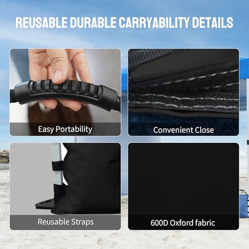 EASY TO INSTALL – The three velcro straps securely attach the sandbags to the legs of the tent, adding weight to each leg to prevent it from being blown over and enabling it to withstand harsh weather conditions such as strong winds and heavy rain. The handle on top bags makes it easy carry
